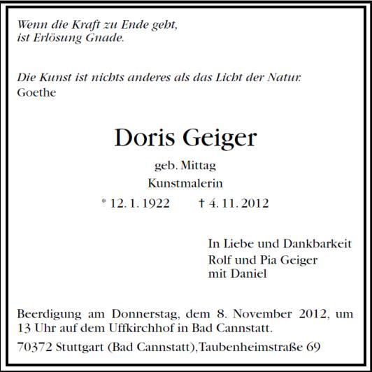 Bestattungstermin: 27.9.2012 um: 14 Uhr