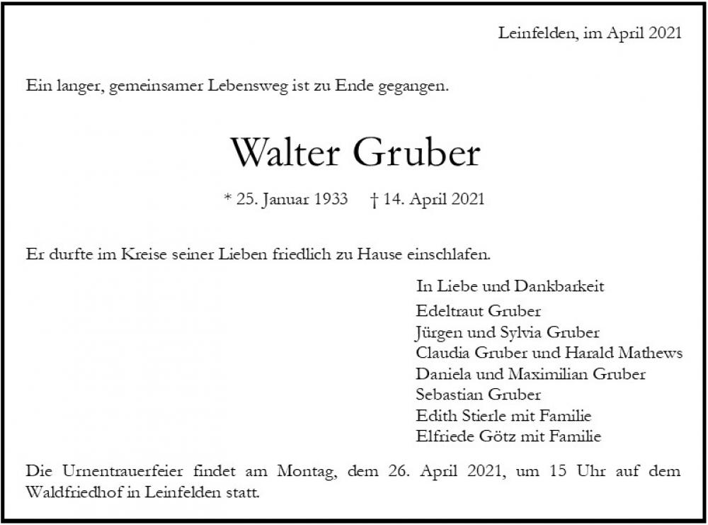 Bestattungstermin: 25.4.2024 um: 14:00 Uhr