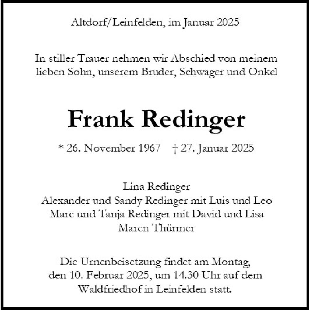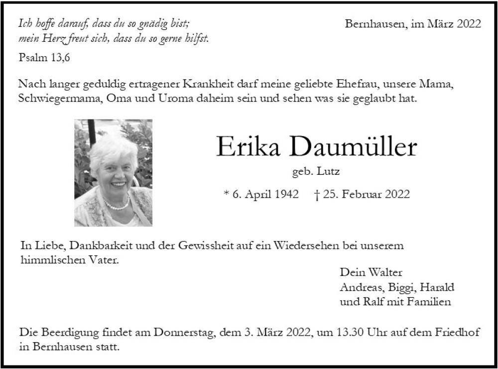 Bestattungstermin: 27.2.2025 um: 13:00 Uhr