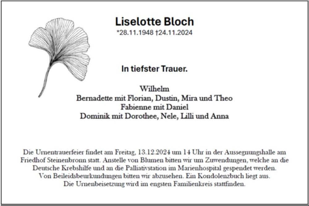 Bestattungstermin: 15.11.2024 um: 12:00 Uhr