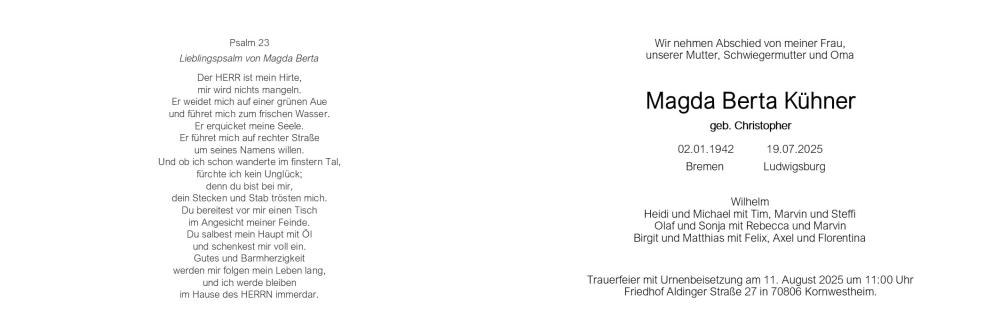 Bestattungstermin: 22.8.2025 um: 11:00 Uhr